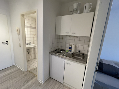 Vollständig möbliert, Laminatboden und Fliessen, Schrank, Bett, Schreibtisch, Esstisch, Fernseher, Küche mit Kühlschrank. Vollständig inventarisiert: Kaffeemaschine, Wasserkocher, Besteck, Töpfe, Pfannen, Gläser, Kochgeschirr, LED-Fernseher, WLAN-Internet-Flatrate etc. |